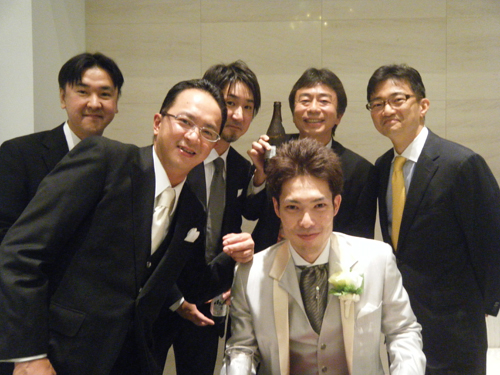 高砂に集結したハンド部関係者で記念撮影です。 披露宴も滞りなく進行して、無事にお開き。 その後はハンドボールOB会関係者で2軒目〜3軒目〜と廻りまして、、、 私は新横浜駅前のフジビューホテルを予約していたのですが、 終電をのがした上にホテルが満室で帰宅難民状態となった後輩2名が 狭いシングルルームまでやって来まして、 結局男3名で雑魚寝状態、、、 あ〜(笑)、ハンド関係で飲むといつも壊滅状態になりますなぁ。。。