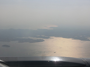 身体をキンキンに冷やした後は鹿児島空港に向かいました。 今日の機材はB767-300でして、 現在の全日空の機材の中では2−3−2のシート配列ということもあって、 最も好きかもしれません。 途中、東京湾上空を通過中に、左手前に猿島、遠くに江ノ島が見えました。