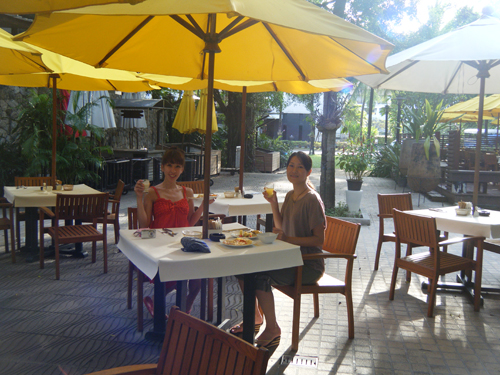 朝起きて朝食会場に向かうと、そこには優雅に食事をしている我が女性スタッフの姿がありました。