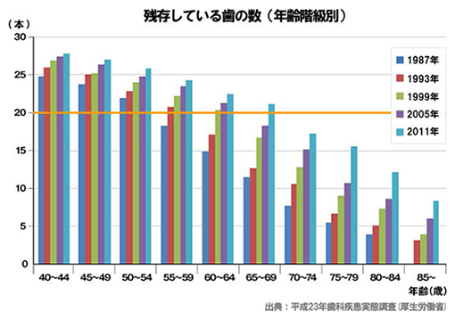 平成23年度の歯科疾患実態調査によると、80歳で20本以上の歯を有する人の割合が38.3%だそうで、これはもちろん過去最高です。